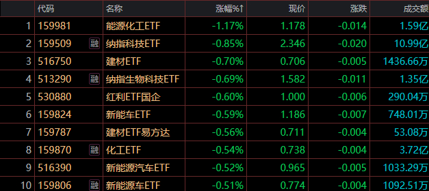 能源化工ETF(159981)领跌1.17%,纳指科技ETF(159509)跌0.85%,建材ETF(516750)跌0.7%。