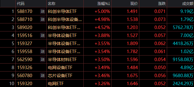 ETF收盘涨跌不一,科创半导体ETF(588170)领涨5.00%,科创半导体设备ETF(588710)涨4.98%,科创半导体ETF鹏华(589020)涨4.52%。