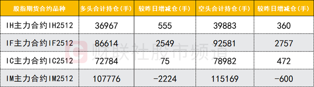 四大期指主力合约中,IH、IF、IC合约多空双方均加仓,IC合约空头加仓数量较多。IM合约多头减仓数量较多。