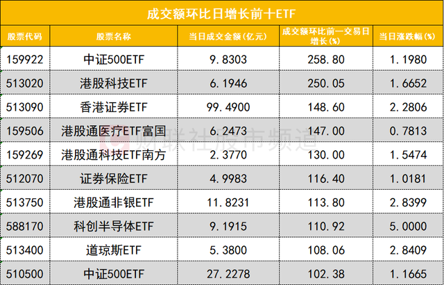 从成交额环比增长前十的ETF来看,中证500ETF(159922)成交额环比增长258%位居首位;港股科技ETF(513020)成交额环比增长250%位居次席。