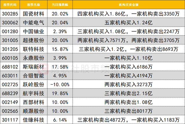今日龙虎榜机构活跃度较高,商业航天今日表现活跃,其中国瓷材料获四家机构买入1.86亿,同时遭一家机构卖出3350万;超捷股份获两家机构买入7571万,同时遭两家机构卖出3705万;顺灏股份遭三家机构卖出8017万;航宇科技遭三家机构卖出2.15亿。