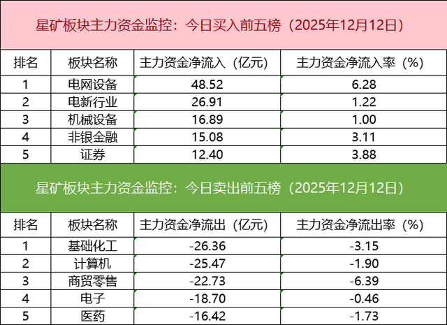 从主力板块资金监控数据来看,电网设备板块主力资金净流入居首。