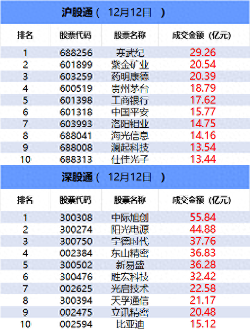 从沪股通前十大成交个股来看,寒武纪位居首位;紫金矿业和药明康德分居二、三位。