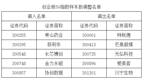 创业板50指数更换5只样本,常山药业、菲利华、长芯博创、金力永磁、协创数据等调入指数。