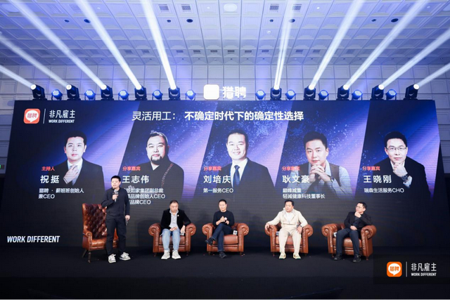 在《灵活用工:不确定时代下的确定性选择》圆桌论坛环节,首旅如家集团副总裁华驿品牌创始人CEO、万信品牌CEO王志伟,第一服务CEO刘培庆,巅峰减重轻减健康科技董事长耿文豪,瑞森生活服务CHO王晓刚,猎聘·薪班班创始人兼CEO祝挺围绕在成本上升与体验升级并行的时代背景下,企业如何通过灵活用工、组织重构与人机协同寻找确定性增长路径展开深入讨论。