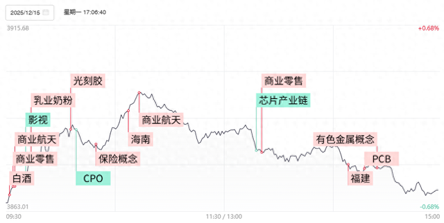 财联社12月15日讯,今日59股涨停,34股炸板,封板率为63%,再升科技6连板,法尔胜、雪人集团、百大集团、中超控股、广西广电、华菱线缆3连板,雷科防务16天8板,航天机电12天7板,太阳电缆10天6板,北交所科强股份、泓禧科技30cm首板。市场震荡调整,沪指盘中翻红后再度回落,创业板指低开低走。沪深两市成交额1.77万亿,较上一个交易日缩量3188亿。盘面上,市场热点快速轮动,全市场超2900只个股下跌。板块方面,乳业、保险、零售、贵金属等板块涨幅居前,CPO、影视院线、半导体等板块跌幅居前。截至收盘,沪指跌0.55%,深成指跌1.1%,创业板指跌1.77%。
