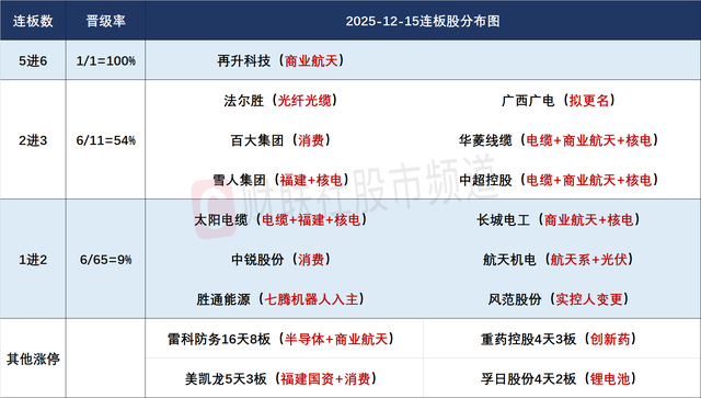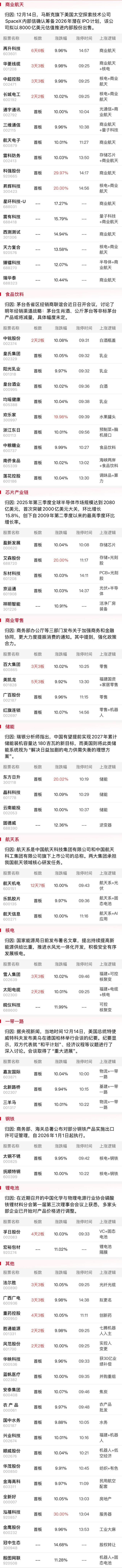 据报道,SpaceX确认正在为2026年进行潜在IPO做准备,内部股票定价为每股421美元,使SpaceX估值约为8000亿美元。商业航天概念延续上周强势,再升科技实现5进6,但盘中经历多次炸板,华菱线缆、中超控股、长城电工全天封死一字涨停,科强股份、昇辉科技等低位补涨股继续涌现。从板块内领涨方向看,该板块从此前围绕上市公司名称的“航天XX”炒作到目前向上游材料等细分扩散,与此前的机器人、低空经济方向演绎如出一辙。因此该板块连续逼空后大波动临近,但一些逻辑较硬的低位滞涨趋势股仍具备较高安全边际。