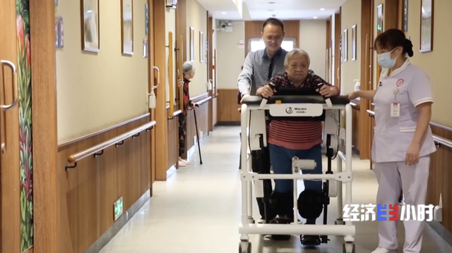 最近,颐养院里来了一个机器人“大宝贝”——下肢外骨骼机器人,双腿双脚固定好后,电动座椅托着老人慢慢“站立”。在它的辅助下,梁彩棠老人在楼道里溜达了起来。