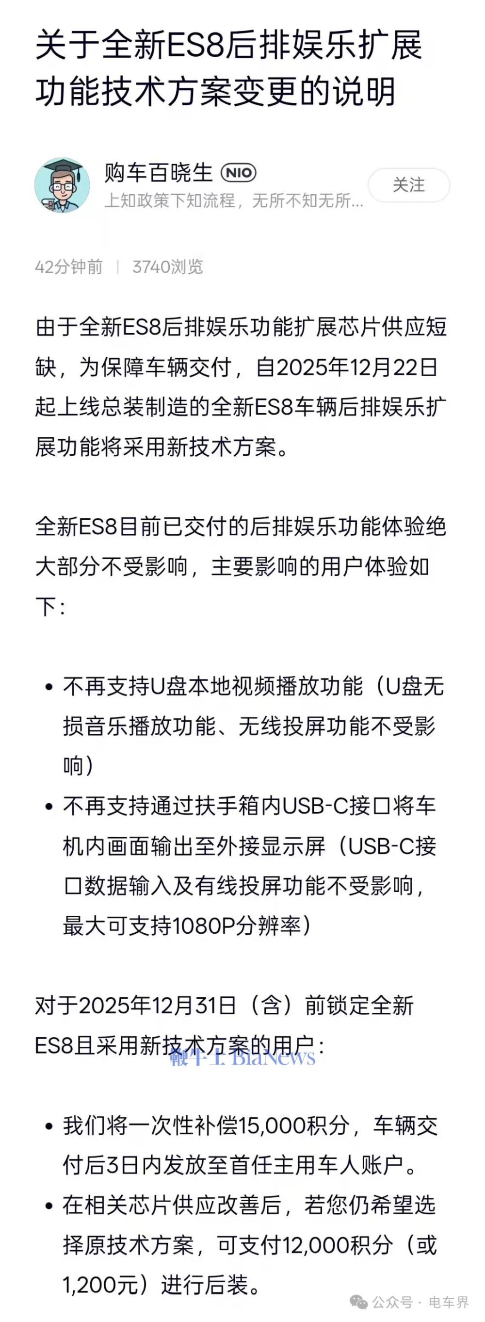 对于2025年12月31日(含)前锁定全新ES8且采用新技术方案的用户,蔚来将一次性补偿15,000积分,车辆交付后3日内发放至首任主用车人账户;在相关芯片供应改善后,若用户仍希望选择原技术方案,可支付12,000积分(或1,200元)进行后装。(转载自:电车界)