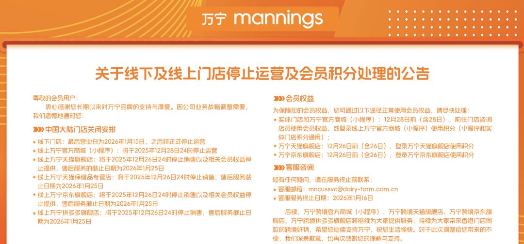 根据万宁在官网发布的公告,其线下门店将于2026年1月15日终止运营;线上官方商城(小程序)12月28日24时停运,天猫、京东、拼多多等旗舰店则于12月26日24时停止销售,售后服务均延续至2026年1月25日。