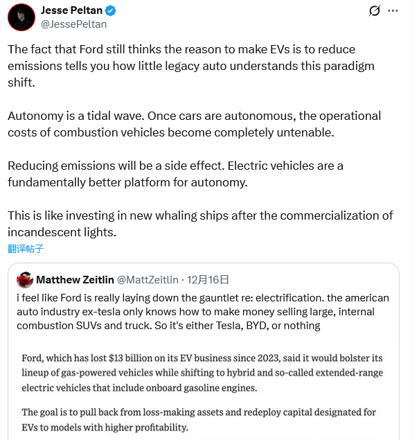 比特币矿企HODL Ranch联合创始人兼首席技术官杰西·佩尔坦(Jesse Peltan)认为,福特仍然认为生产电动汽车的理由是减少排放,这说明传统汽车行业对此种范式转变的理解有多么匮乏。