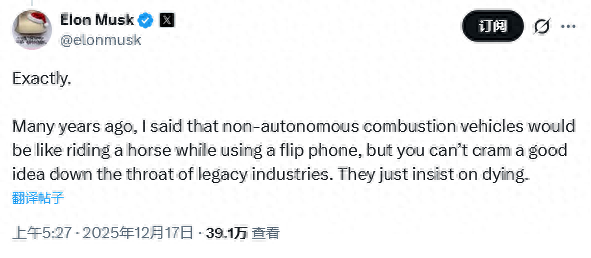 对此马斯克表示赞同:"多年前我就说过,非自动驾驶燃油车就像骑马时用翻盖手机一样;但你不可能把好想法强加给传统产业,它们只会执意走向消亡。"