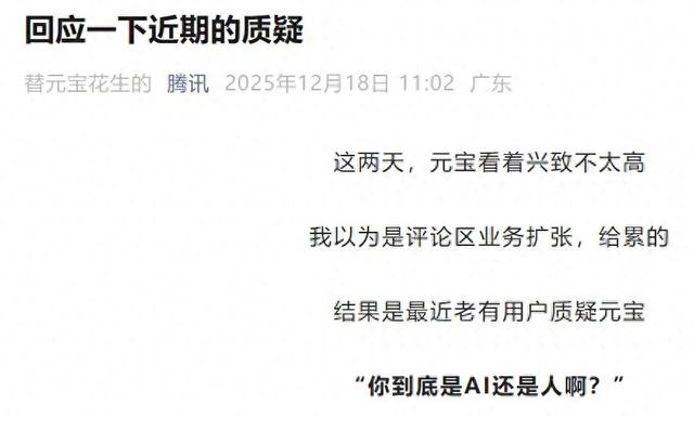 【环球网科技综合报道】12月18日消息,腾讯官方发文回应近期关于“内容由 AI 生成”相关话题的质疑:一切带有“内容由AI生成”字样的评论均由元宝AI生成,背后没有人工运营,没有团队轮班。