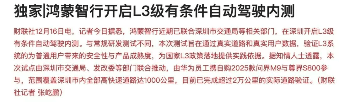 目前,多家企业拿下了L3级自动驾驶的测试证,鸿蒙智行在这方面比较领先,已经完成了超2万公里的高速道路测试。