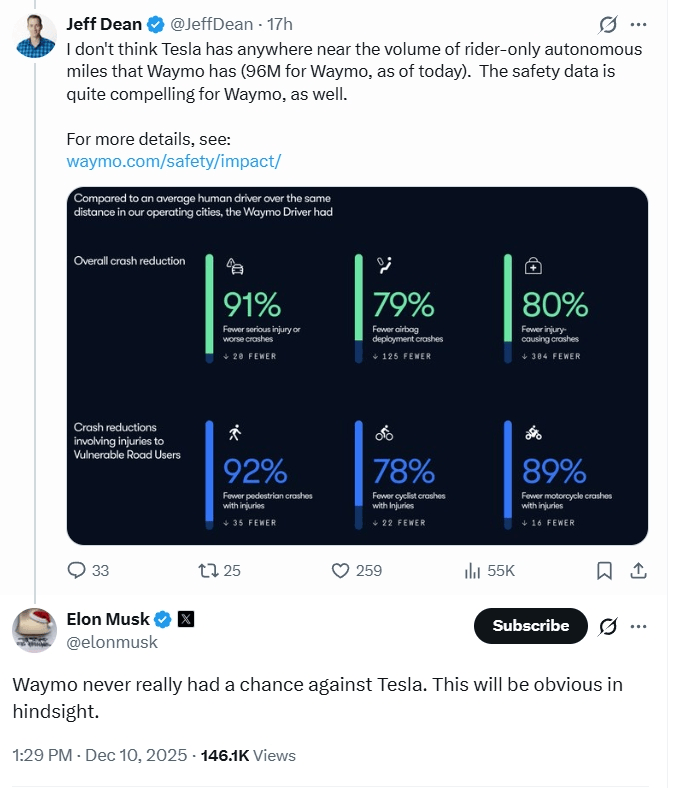 开头这句话,是上周他在X上回击谷歌首席科学家Jeff Dean的言论,直接表示了对老牌自动驾驶企业Waymo的轻视。