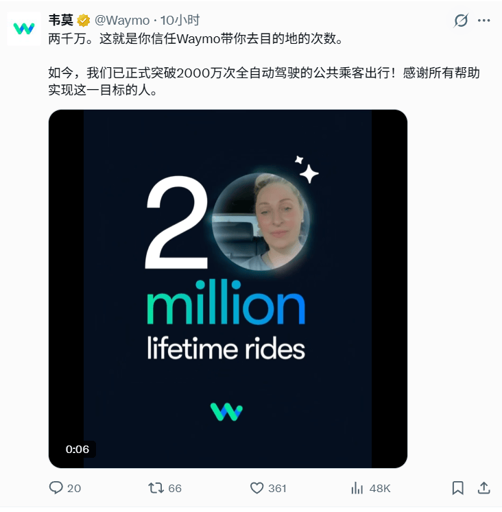 今天上午,Waymo还给出了一记有力还击:Waymo的Robotaxi已经完成了2000万次服务。