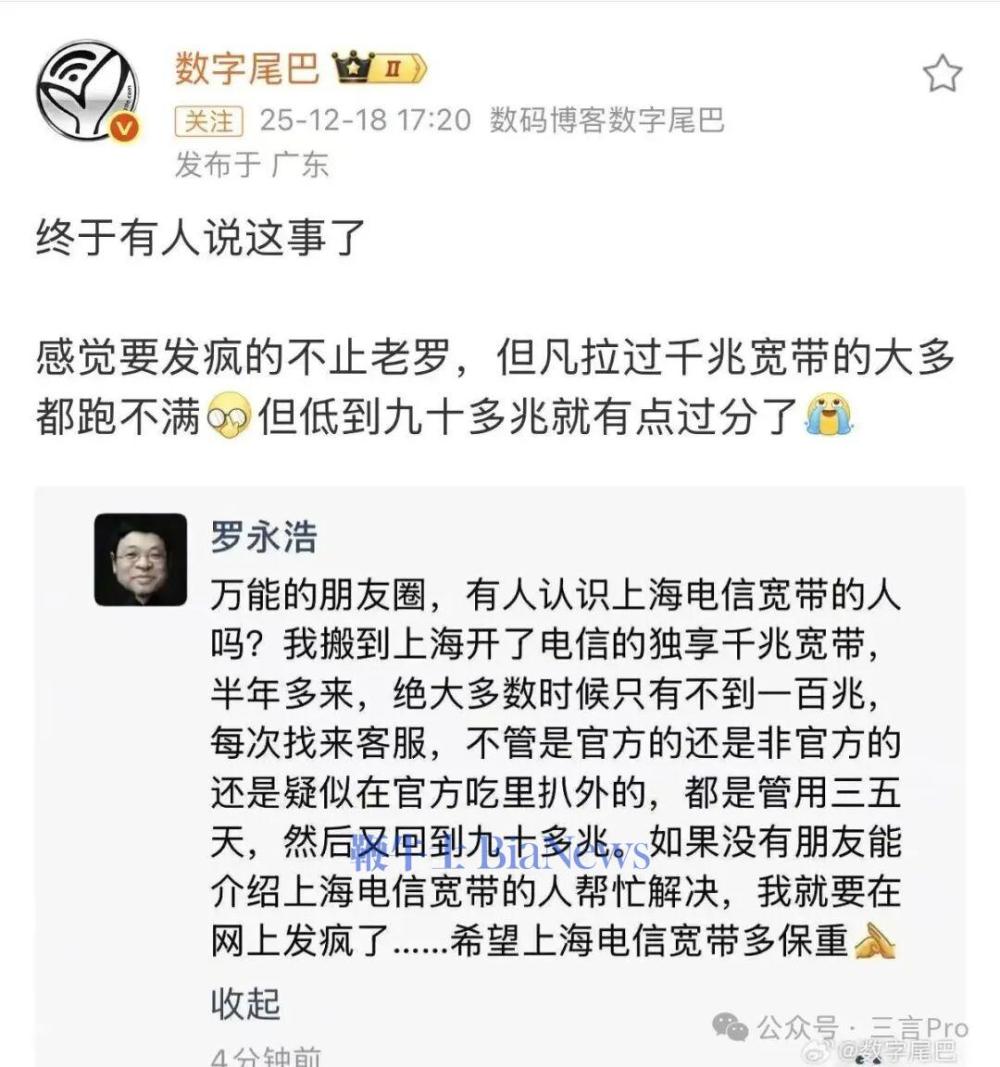 近日,罗永浩在朋友圈吐槽上海电信宽带,称独享千兆宽带实际不到百兆,并放话再得不到解决将“在网上发疯”: