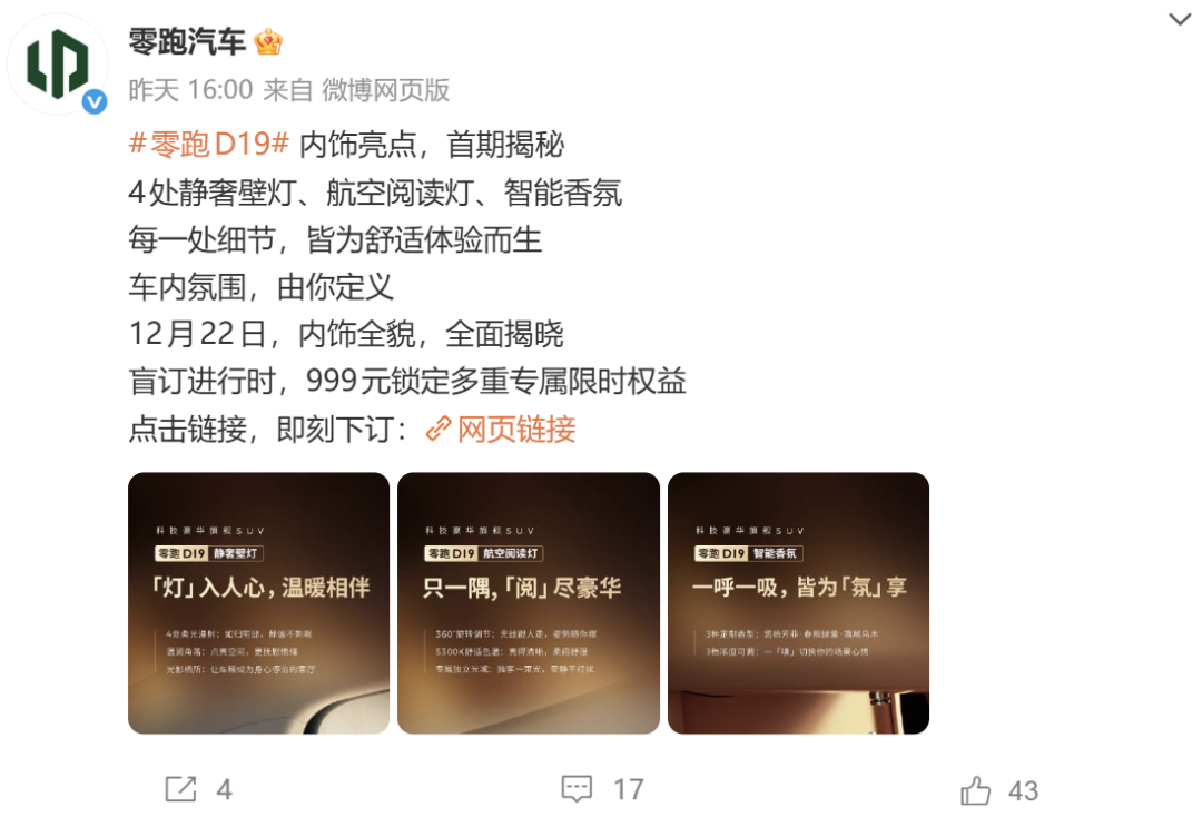 12月19日,零跑汽车旗下全新车型——零跑D19内饰设计首次曝光。据了解,零跑D19最早于10月16日首发亮相,11月1日开启盲订,盲订用户可交付999元意向金确认定购,并享有优先排产权并加速交付。官方表示,新车将在12月22日正式公布内饰设计,预计新车将于2026年上半年上市,售价或为30万元级别。