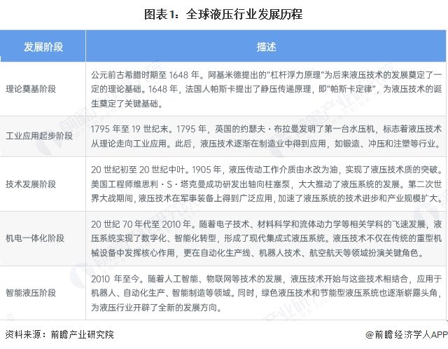 全球液压产业从古代的理论奠基起步,历经工业应用开启、技术不断突破、与电子技术融合以及走向智能化等阶段,逐渐发展成为一个技术先进、应用广泛的重要产业,在全球工业发展中发挥着关键作用。