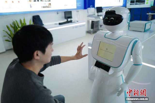 12月20日,国家人工智能应用中试基地(医疗)·浙江产业园在浙江杭州正式开园,同步发布年度系列重大成果。图为医疗服务机器人与参观者进行阿尔茨海默症检测互动。中新社记者 张煜欢 摄