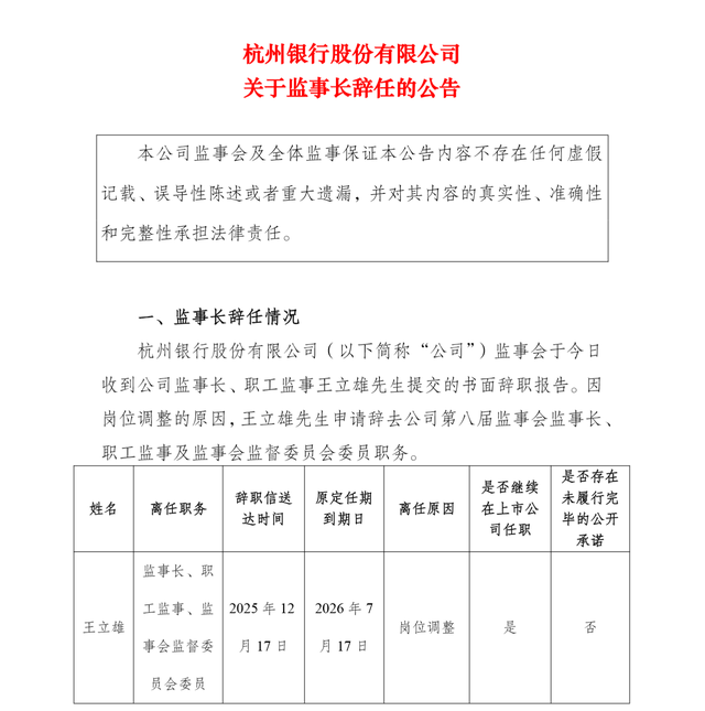 撤销监事会的流程尚未走完,但人事调整已先行。同日,杭州银行公告称,该行监事长王立雄因岗位调整申请辞去公司第八届监事会监事长、职工监事及监事会监督委员会委员职务。