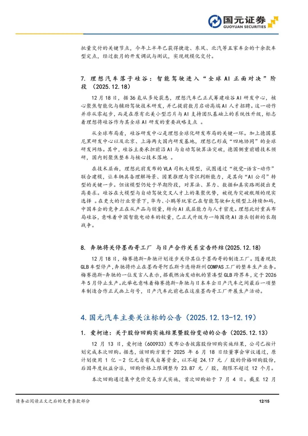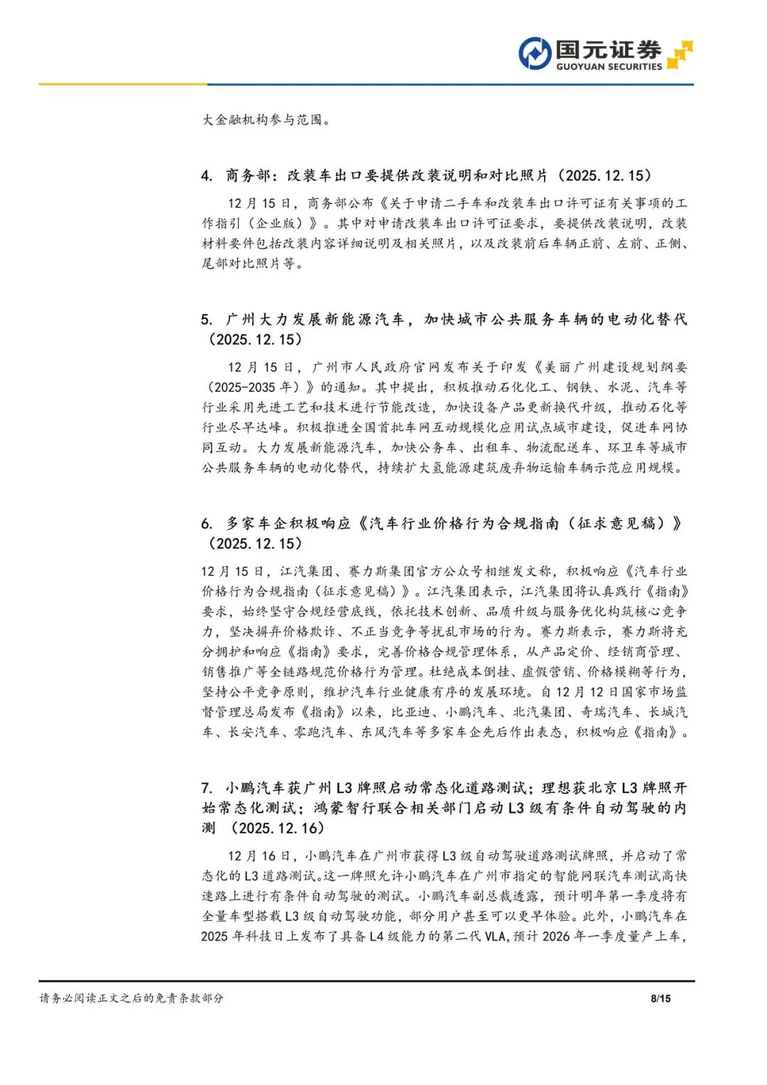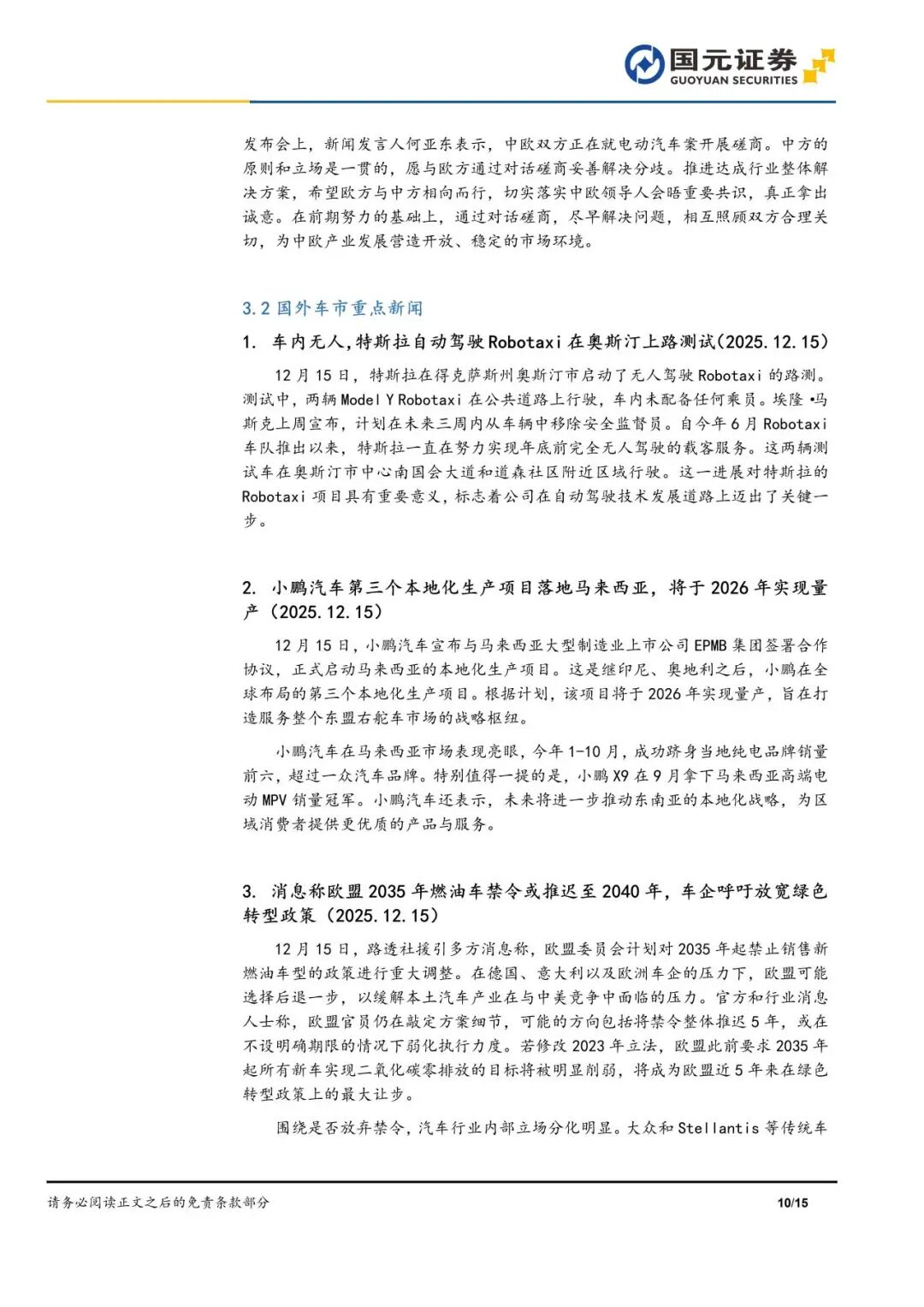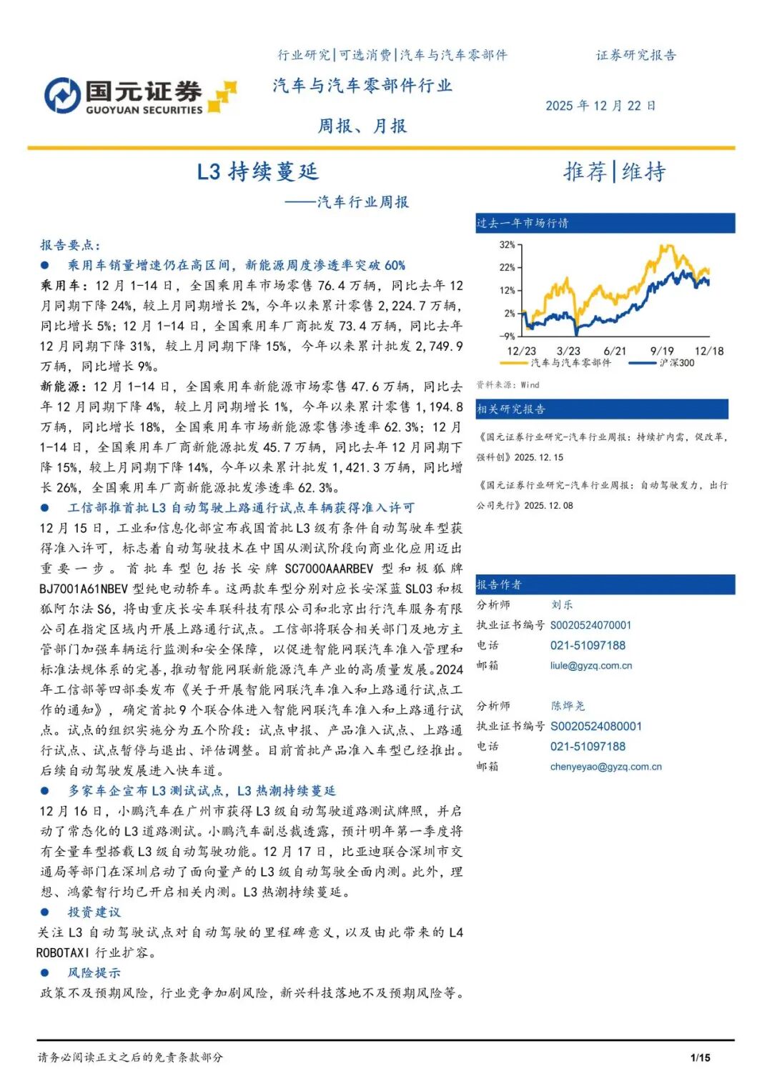 本报告摘自国元证券2025年12月22日已发布的《L3持续蔓延——汽车行业周报》,具体报告及分析内容请详见报告。若因对报告的摘编等产生歧义,应以报告发布当日的完整内容为准。