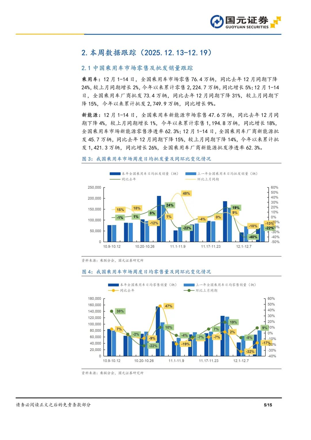乘用车:12月1-14日,全国乘用车市场零售76.4万辆,同比去年12月同期下降24%,较上月同期增长2%,今年以来累计零售2,224.7万辆,同比增长5%;12月1-14日,全国乘用车厂商批发73.4万辆,同比去年12月同期下降31%,较上月同期下降15%,今年以来累计批发2,749.9万辆,同比增长9%。