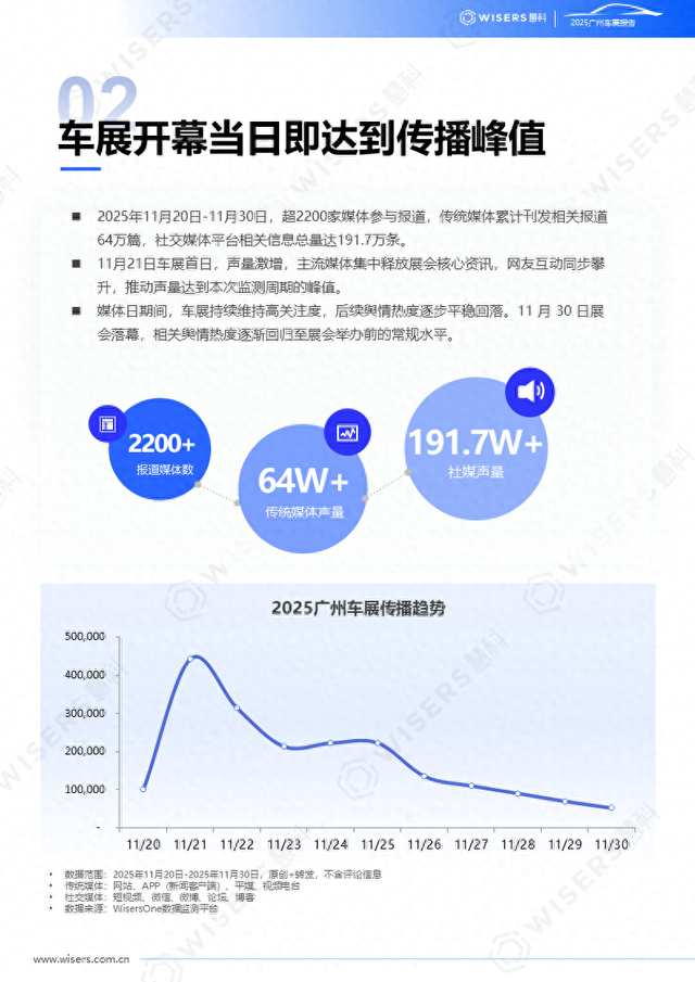 《2025广州车展舆情报告》显示,车展期间超2,200家媒体参与报道,传统媒体刊发报道64万篇,社交媒体相关信息总量达191.7万条。开幕日(11月21日)声量即达到峰值,随后热度逐步回落。在情感分布上,整体舆情呈现显著正向态势,正面话题占比达97%。