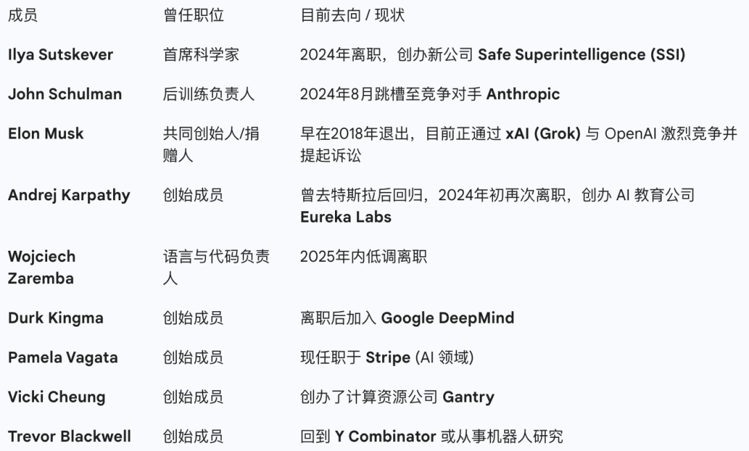 曾经的11人名单中,其余9人已全部离开,且大多数成为了OpenAI的直接竞争对手: