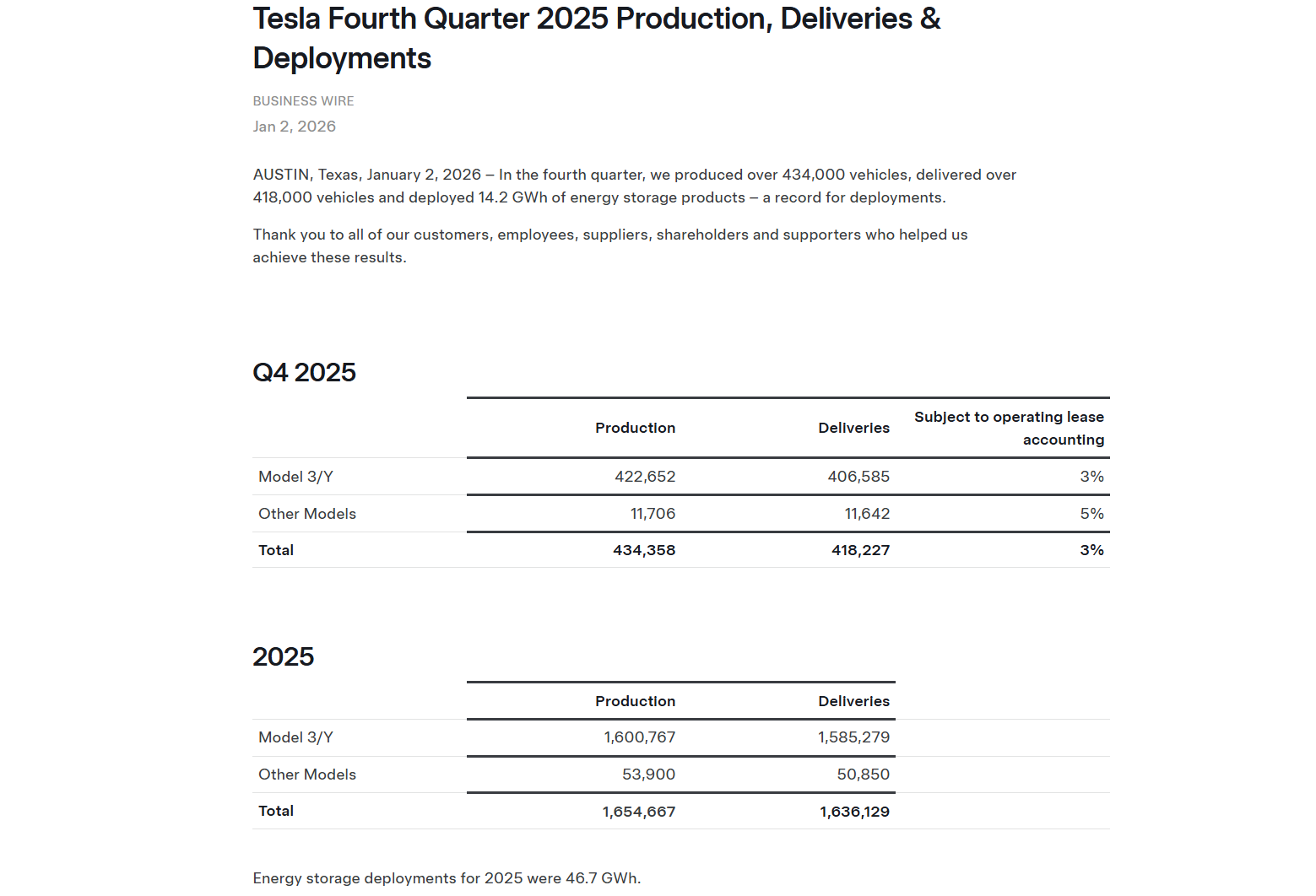 根据特斯拉官网挂出的数据,去年最后3个月共交付418,227辆新车、生产434,358辆;全年交付1,636,129辆,生产1,654,667辆。最终数据不仅低于大多数分析师预期,也低于本周初公司自己制作的“市场共识预期”。