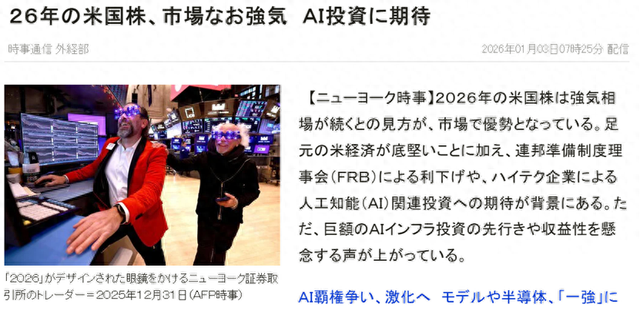 日本时事通讯社也发文称,市场普遍认为2026年美国股市将持续走强,得益于稳固的美国经济,联邦储备委员会的降息和对企业在人工智能(AI)相关领域的投资的期待;然而,对巨额AI基础设施投资的前景和盈利能力的担忧也开始浮现。