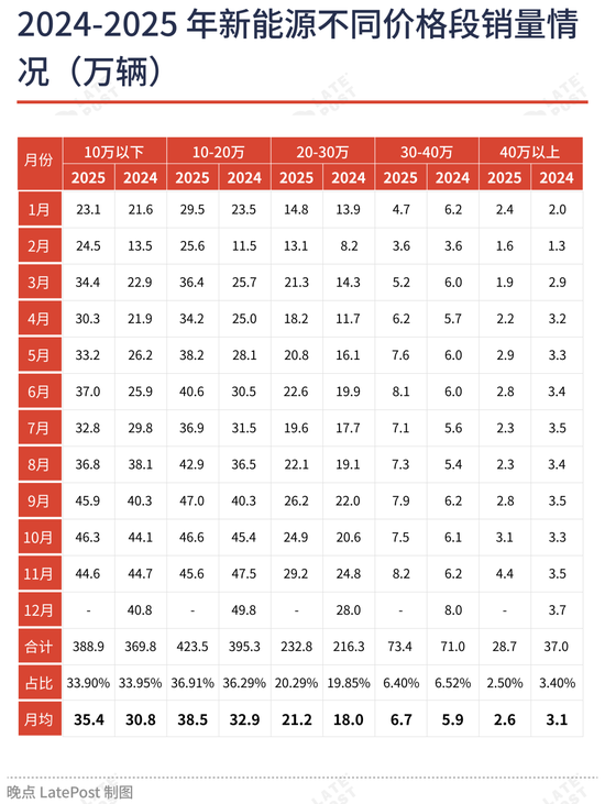从理想的调整来看,从产品部门分离出产品线,任命产品线总裁,并将产品线进一步整合,越来越像丰田的 CE 模式。此前理想的问题就在于,针对原本并不大的细分市场中,将自己的组织分为三个产品线,资源和精力过于分散。从 2024-2025 年的月度新能源市场分价位段的销量数据来看,40 万以上大概占总体市场 3% 左右,30-40 万大概在 6.5% 左右,20-30 万市场虽然大,但也只是占总体市场 20% 上下。