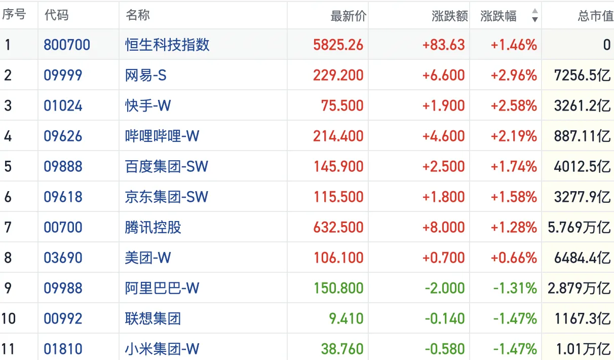 盘面上,今日大型科技股多数上扬,网易涨近3%,快手涨2.58%,百度、腾讯、京东涨超1.2%,阿里巴巴、小米逆势走低。
