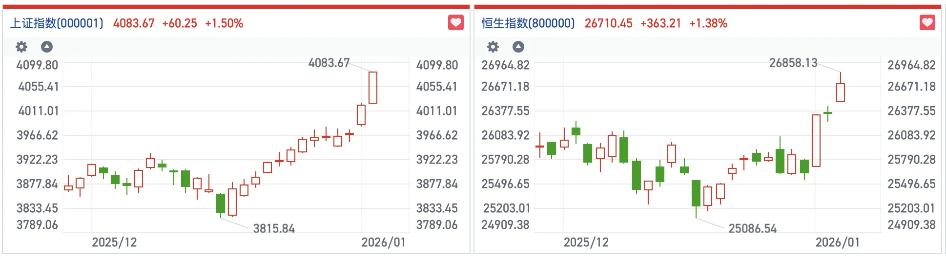 财联社1月6日讯(编辑 冯轶)今日港股三大指数全天高位震荡,市场总体表现强势。截至收盘,恒生指数涨1.38%、国企指数1.05%、恒生科技指数涨1.46%。