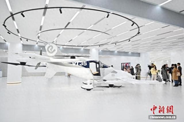 1月6日,“新春走基层”媒体调研行黄埔低空经济专场在广州市黄埔区开展。图为亿航智能的长航程无人驾驶载人航空器VT35吸引媒体关注。中新社记者 陈楚红 摄