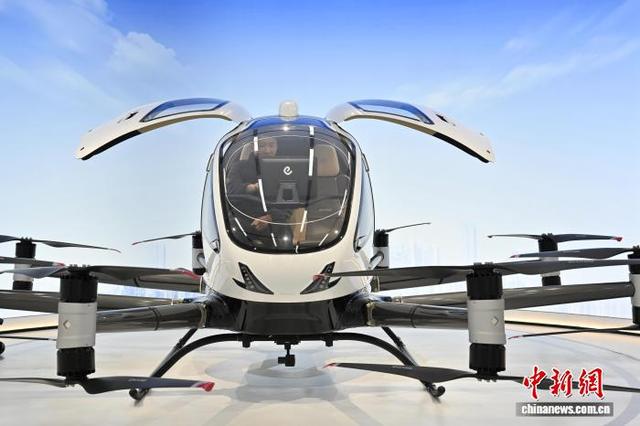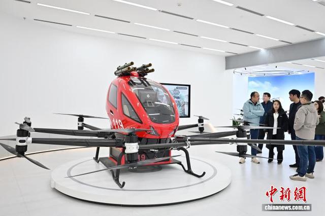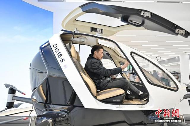 1月6日,“新春走基层”媒体调研行黄埔低空经济专场在广州市黄埔区开展。图为亿航智能的无人驾驶载人航空器EH216-S吸引参观者体验。中新社记者 陈楚红 摄
