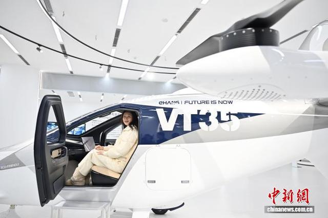 1月6日,“新春走基层”媒体调研行黄埔低空经济专场在广州市黄埔区开展。图为亿航智能的长航程无人驾驶载人航空器VT35吸引记者参观体验。中新社记者 陈楚红 摄
