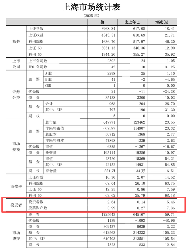 据上交所统计,截至2025年末,沪市股票账户数已达3.99亿户,投资者数量已达2.64亿。