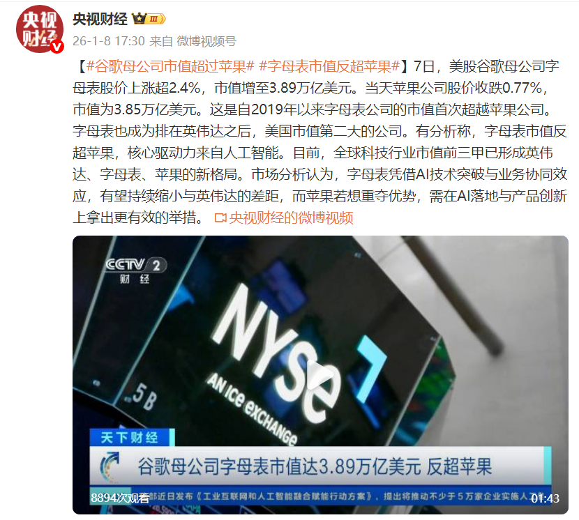 7日,美股谷歌母公司字母表股价上涨超2.4%,市值增至3.89万亿美元。当天苹果公司股价收跌0.77%,市值为3.85万亿美元。这是自2019年以来字母表公司的市值首次超越苹果公司。字母表也成为排在英伟达之后,美国市值第二大的公司。有分析称,字母表市值反超苹果,核心驱动力来自人工智能。目前,全球科技行业市值前三甲已形成英伟达、字母表、苹果的新格局。市场分析认为,字母表凭借AI技术突破与业务协同效应,有望持续缩小与英伟达的差距,而苹果若想重夺优势,需在AI落地与产品创新上拿出更有效的举措。