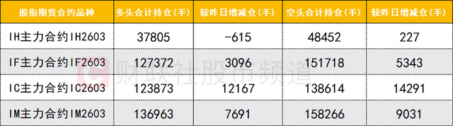 四大期指主力合约中,IF、IC、IM合约多空双方均加仓,IF、IC空头加仓数量较多。