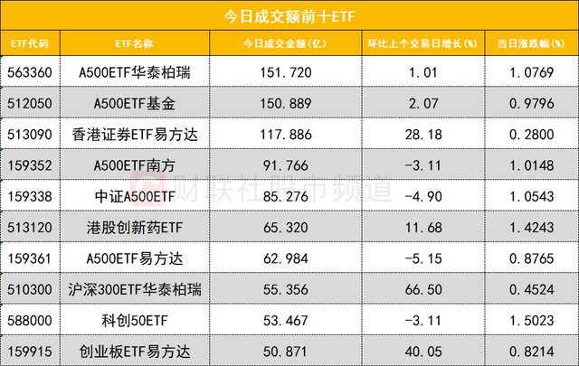 从成交额前十的ETF来看,A500ETF华泰柏瑞(563360)成交额位居首位,A500ETF基金(512050)成交额位居次席。