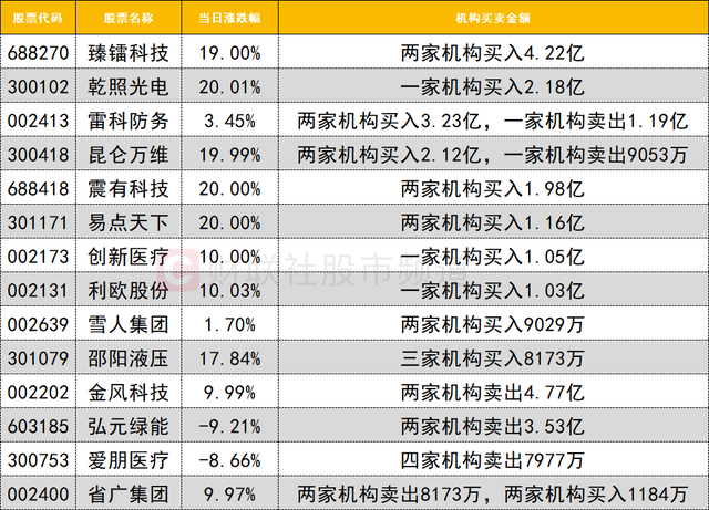 今日龙虎榜机构活跃度较高,买入方面,两只涨停的AI应用概念股获资金青睐,利欧股份获深股通买入2.04亿,同时获一家机构买入1.03亿;昆仑万维获两家机构买入2.12亿,同时深股通买入1.84亿。
