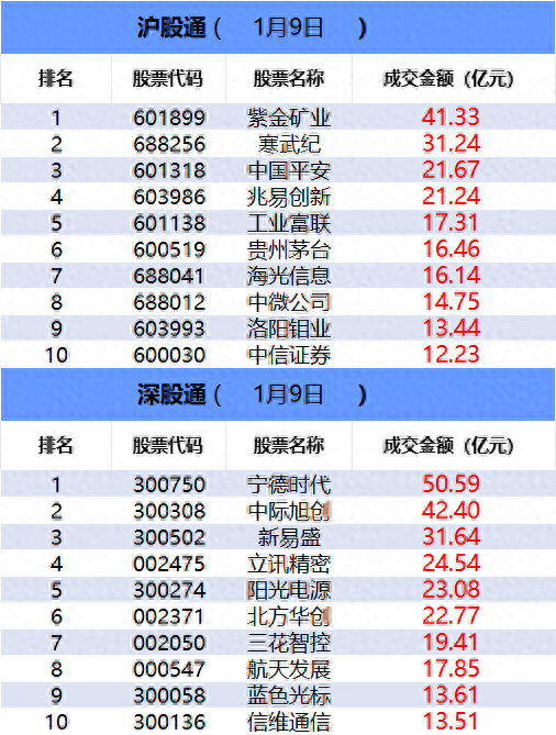 从沪股通前十大成交个股来看,紫金矿业位居首位;寒武纪和中国平安分居二、三位。