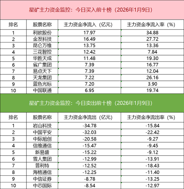 主力资金流出前十的个股所属板块较为分散,岩山科技净流出居首。