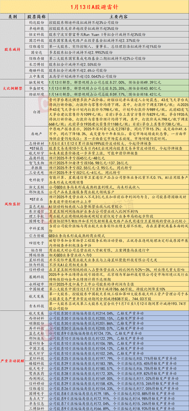 导读:财联社1月13日投资避雷针,近日,A股及海外市场潜在风险事件如下。国内经济信息方面包括:1)上金所、广期所提示投资者做好风险防范工作;2)贵州茅台下调多款产品打款价与零售价;公司方面重点关注包括:1)20CM涨停6连板志特新材1月5日至1月12日累计涨幅199%股价波动较大,今起停牌核查;2)*ST铖昌股票交易连续10个交易日内4次出现同向股票交易异常波动情形,今起停牌核查;海外市场重点关注包括:1)美国司法部对美联储主席鲍威尔启动刑事调查,担忧情绪推动“抛售美国”交易卷土重来;2)摩根大通不再预计美联储今年降息,并预测在2027年加息。
