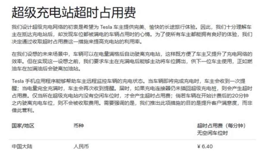 官方表示,仅当所在超级充电站内没有空闲车位时,才会产生超时占用费;