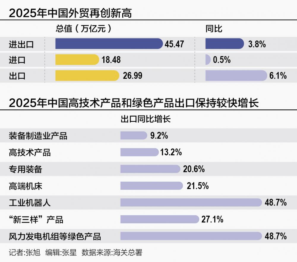 据海关统计,2025年我国外贸进出口达45.47万亿元,增长3.8%。其中,出口26.99万亿元,增长6.1%;进口18.48万亿元,增长0.5%。全年进出口总值迈上新台阶,超过45万亿元,创历史新高,我国将继续保持全球货物贸易第一大国地位。