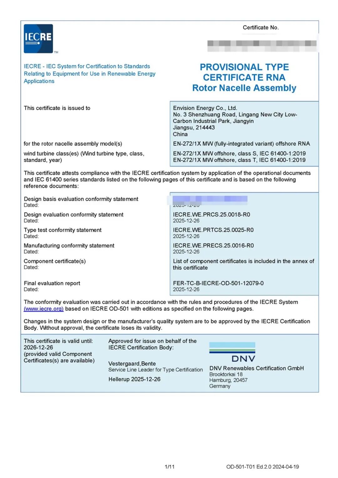 近日,远景能源海上风电机组在国际权威认证中取得关键突破:Model Y平台多款机型斩获同级产品全球首个型式A证,该平台机组风轮直径252m,覆盖功率范围10-12MW;EN-272/16.7摘得全球同级产品首个DNV权威型式认证;同时,EN-252系列叶片率先完成全尺寸测试验证,开创行业先河。高公信力认证的集中获得,标志着远景风机产品从核心部件到整机系统均达到国际最高标准,为全球海上风电提供了经过严苛验证、可靠可信的中国方案。