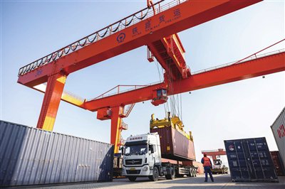 昨天,铁路湖州西站,货物集装箱正在装卸,运输车辆往来穿行。本月以来,铁路湖州西站、湖州西铁路货场凭借长三角独特区位交通优势,优化作业班组,全力冲刺一季度生产指标。