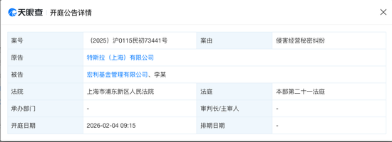 据天眼查信息,宏利基金及李程被特斯拉(上海)有限公司(下称特斯拉)起诉了,案由是侵害经营秘密纠纷,案件将于2月4日在上海市浦东新区人民法院开庭。